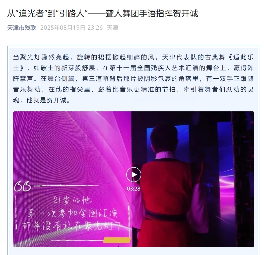21岁的手掌还带着少年人的稚嫩,却已能稳稳托住整个舞蹈的呼吸,当掌声如潮水般涌来,贺开诚举起的手臂这才缓缓落下。从追逐舞台光芒的舞者,转变为幕后的无声引路人,贺开诚让我们看到了听障群体对梦想的执着追求。在人生的舞台上,无论身处何处,只要心怀热爱、努力付出,都能绽放出属于自己的光彩 。